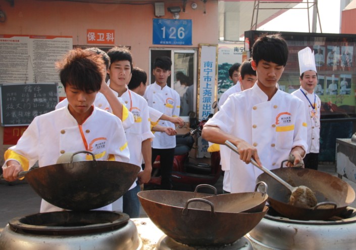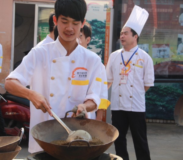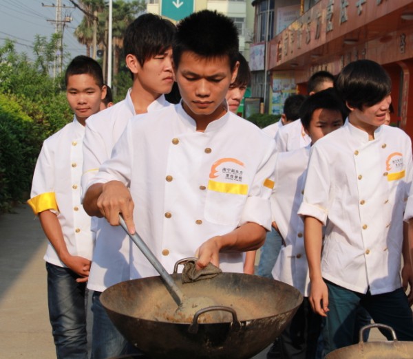 当那群新生面孔出现在广西华南烹饪学校的时候,学校里又多了一道亮丽的风景。经过前段时间的军训,135班的同学们进入到了学习的生活中,同学们在苏老师的带领下练习抛锅。