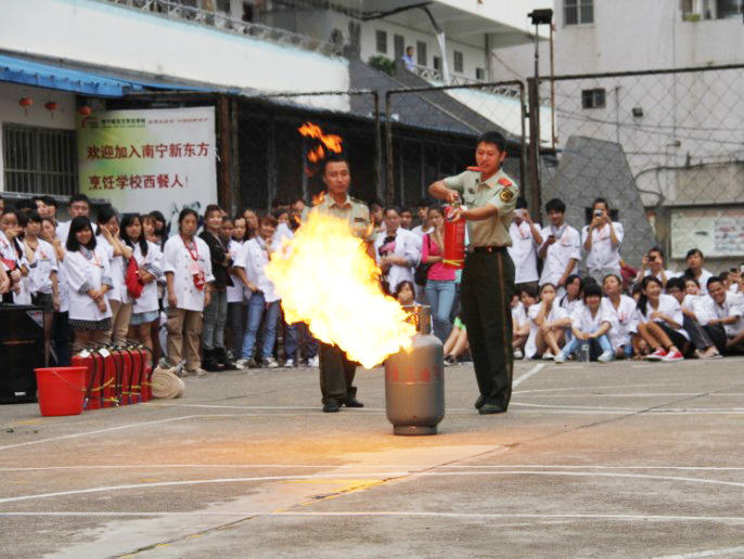 本次消防演习共分为理论讲解和学生实战演练两大部分。首先,广西区消防大队队员给同学们讲解了校园火灾特点、酒店、KTV等火灾案例、火灾原因及预防措施,并就如何扑灭初期火灾、组织人员疏散及火场逃生自救等消防安全知识进行了讲解和示范。通过讲解示范,与会师生真正掌握了用灭火器扑灭初起火灾的方法和技巧。