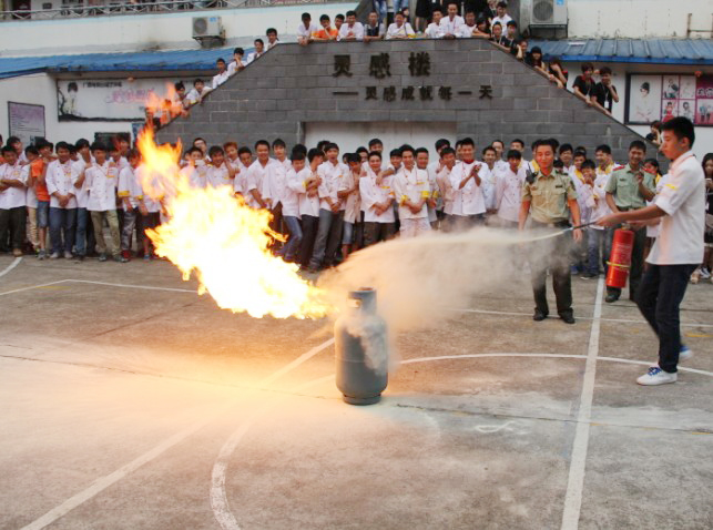 讲解完后,后勤保障部还组织同学们灭火现场演练。操场上,指导员打开了煤气阀门,顿时烧起熊熊的烈火,消防大队队长首先演示了一遍灭火器灭火的方法,随后,学生代表上前拿起灭火器灭火。在工作人员的指点下,学生们拿起灭火器,拔插销、对准火焰根部、压手把、随着白色干粉的喷涌而出,大火应声而灭,随后关起煤气阀门。周围响起了阵阵热烈的掌声。