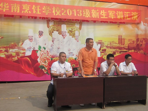 广西华南烹饪学校明秀校区后勤主管万家国给学生讲话