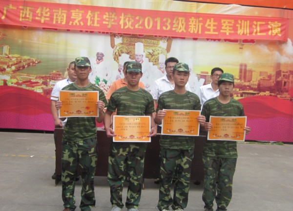 军训汇演上校领导对广西华南烹饪学校的军训新生们的辛勤训练表示肯定和表扬,同时要求广西华南烹饪学校所有的学子们要发扬不怕苦,不怕累的精神,认真学习专业知识,团结友爱,提高自律意识,养成良好的习惯,在广西华南烹饪学校里充分展现自我,走向成功,与学校一起共创辉煌。