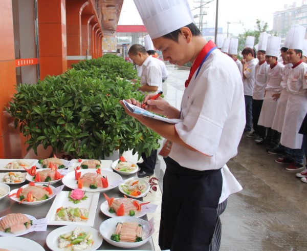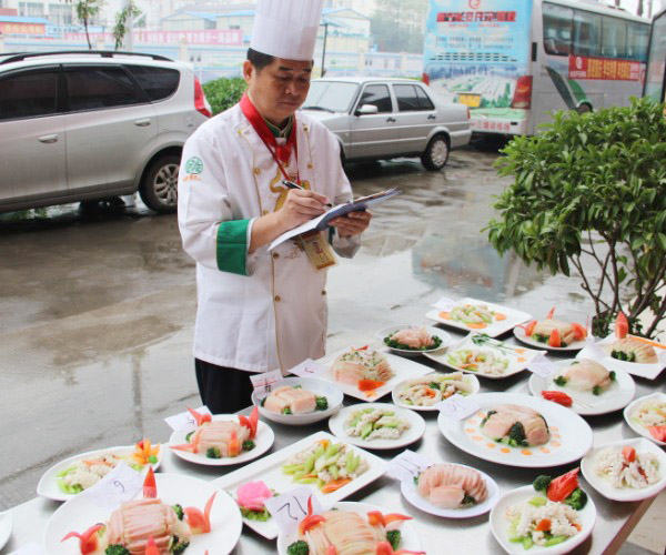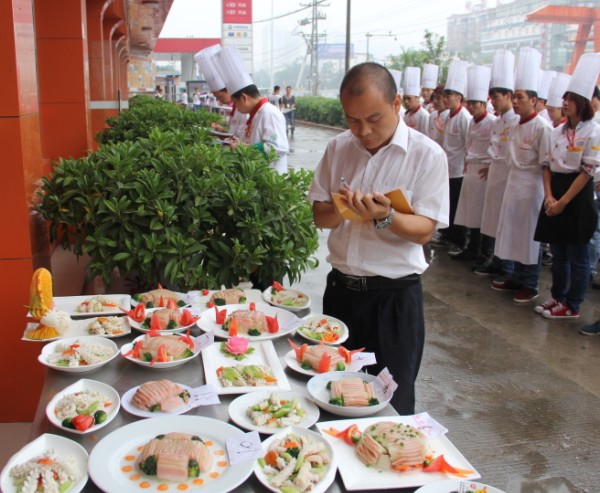 广西华南烹饪学校教务主任黄盛大师给学生作品评分
