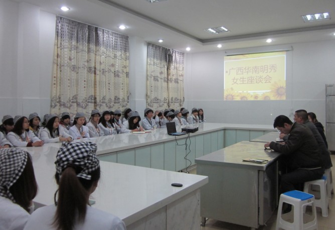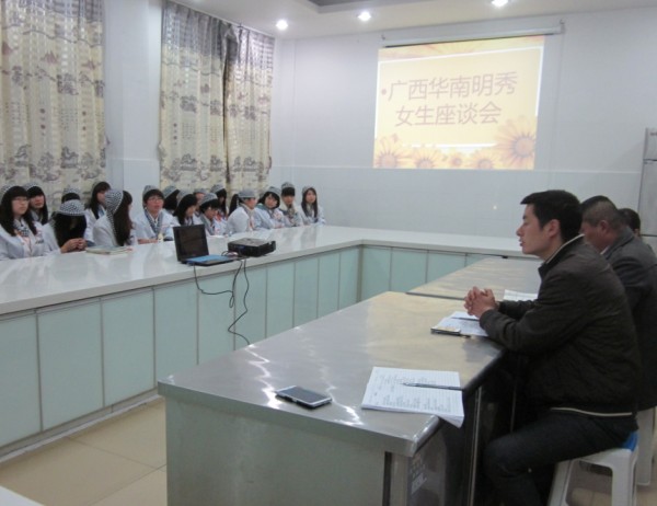 2月20日下午,广西华南烹饪学校明秀校区西点班女生专门举行了一场别开生面的座谈会,邀请到了校区主任陈新操、校区后勤主任万家国、及教师代表参加了座谈会。会议由何老师主持,座谈会本着为女生解决困难和提供帮助为初衷,期望同学们把握好在校学习好时光,努力学习为今后的人生打下良好的基础。