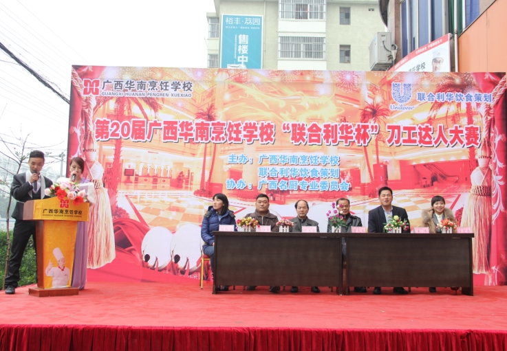 首先是广西餐饮行业协会会长、国家级高级评委曾大文先生为开幕式致辞,接着是校区负责人朱伟主任,代表广西华南烹饪学校全体师生预祝比赛圆满成功,祝每位参赛选手都取得优异成绩。最后在曾大文先生宣布下大赛开始了。