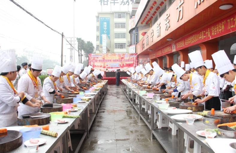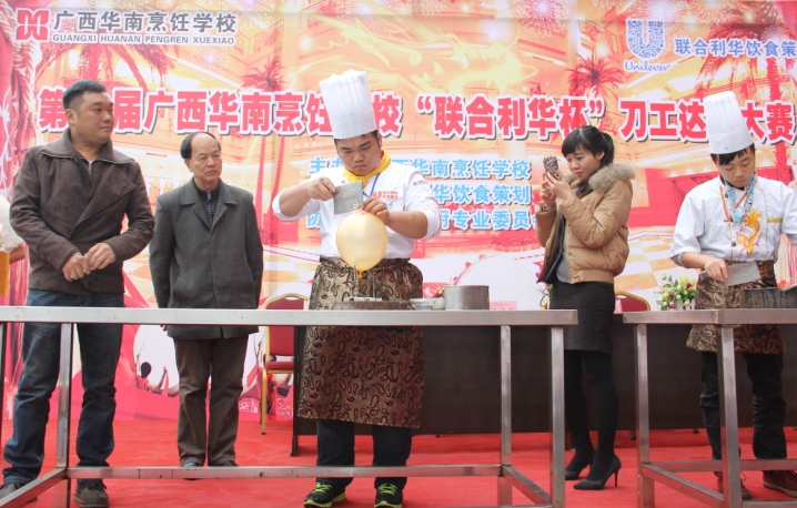 烹调技术离不开“刀、铲、色、香”,因而“刀功”在先,“刀功”是烹调技术的基础,厨师作为餐饮业的精神支柱和领导者,刀工技艺的精湛与否是衡量一个厨师基本功的标准之一。为检验学生对刀工技能的掌握程度,广西华南烹饪学校近期举行了“第二十届广西华南烹饪学校“联合利华杯”刀工达人大赛”,此次比赛的目的是测试同学们的刀工基础,促使同学们充分认识“刀功”对烹调技术的重要性,同时,技能比赛是一个让学生充分展示专业技能的平台,通过比赛,让同学们发现自身的不足,从而达到同学们相互促进,共同提高烹调技术的目的。