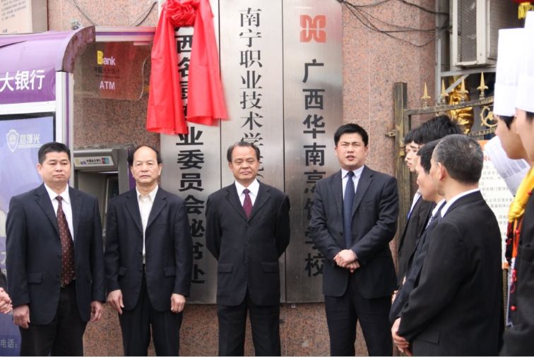 中国烹饪大师黄盛(左一),校区领导朱伟(右二)和广西烹饪餐饮行业协会会长、国家级高级评委曾大文先生(右一),广西烹饪协会常务副会长、国家高级评委何逸奎大师(左二)共同为秘书处揭牌