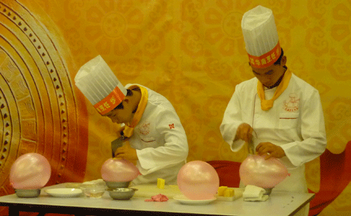 在活动现场,我校学生在大赛上精彩上演了气球上切肉丝、钉子顶气球切萝卜丝、切豆腐穿针、蒙眼在气球上切萝卜丝等节目,吸引大批市民驻足观看和媒体的报道。活动上,我校学生表现出的高超技能和熟练的刀工,赢得了活动主办方和各领导的充分肯定和现场观众的一阵阵掌声。
