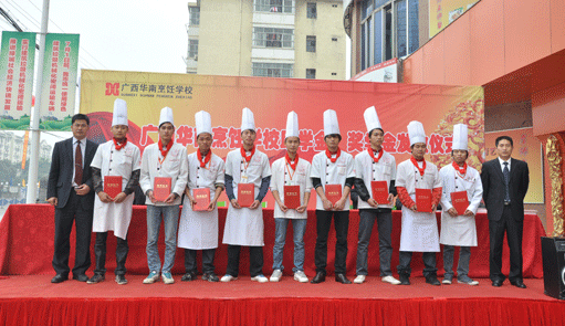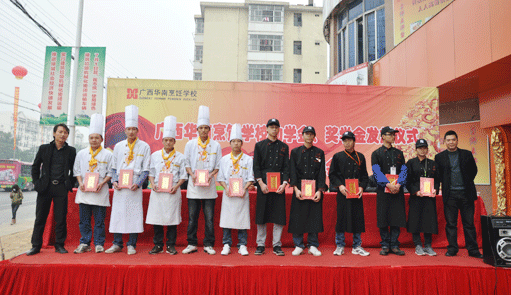 12月28日,广西华南烹饪学校首届“百家宴”暨奖学金、助学金发放仪式在大学路校区举行,校领导朱伟、魏兆权、宇翔、万家国等出席了此次活动,美容美发学校的王勇老师、海纳电脑学校的汪骐老师、考证中心胡加文老师做为嘉宾参与了此次颁奖仪式。此次颁奖仪式除了对奖学金、助学金的发放,同时还对优秀学生和在第十届西乡塘美食节上获奖的学生进行表彰。奖学金获得者共10人,每人2000元;助学金获得者为二年制全体学员,每人750元;优秀学生获得者40余人。