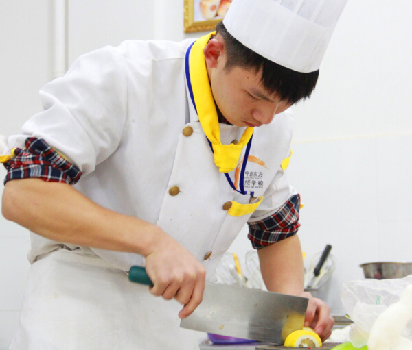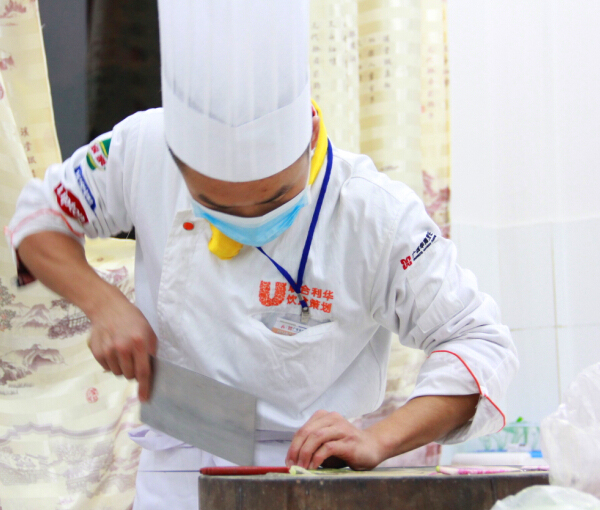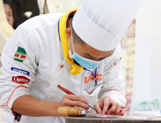 而在广西华南烹饪学校第二十届烹饪大赛冷拼组比赛场上,参赛选手正在紧张的进行着拼盘的制作。每一位参赛选手都凝眉聚神,眼观鼻,心手合一,凌厉的刀在砧板上灵活的飞舞着,奏出美妙的乐章。手腕一转,刀刃在各种食材间时而轻滑,时而勾勒,不一会儿功夫,一个个薄如蝉翼的白萝卜片、用黄瓜皮做成的金鱼等就出现在眼前。