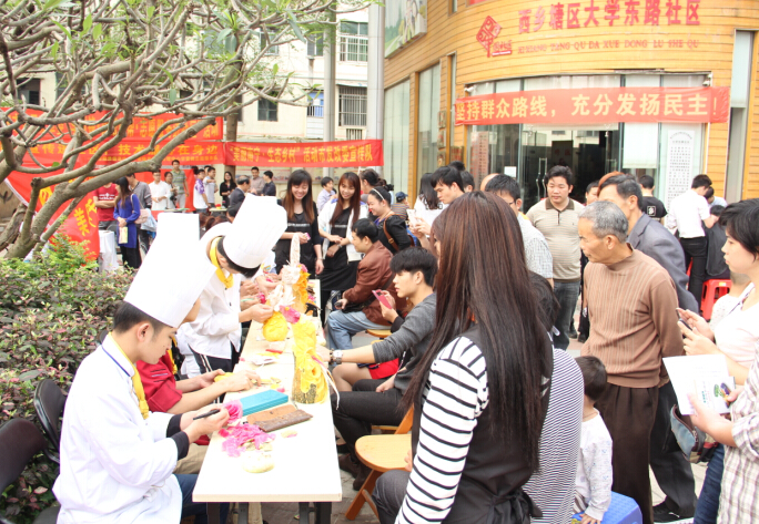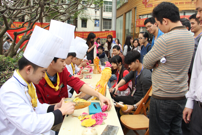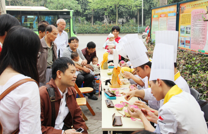 本次义务活动在校学生会唐海涛老师的带领下来到了西乡塘大学东路社区广场活动现场,义务活动持续了一个早上。活动现场,我校学子现场表演精彩雕刻,耐心地为群众进行了烹饪知识宣传。看着一件件精彩绝伦、惟肖惟妙的作品,观看表演的群众响起了热烈的掌声,纷纷被我校学生精湛的雕刻技艺所折服。