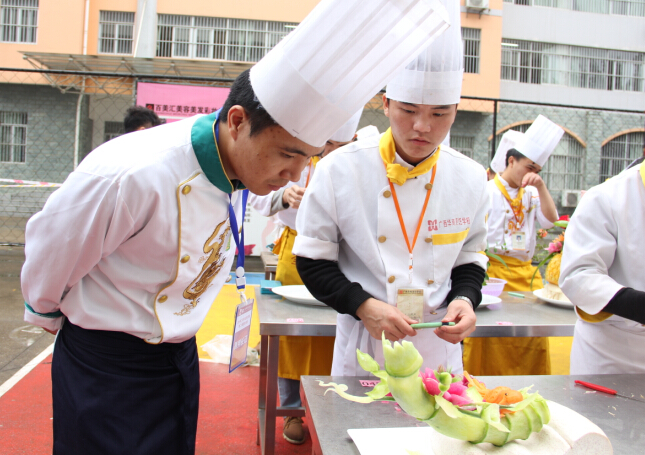 为了提高学生对烹饪艺术学习积极性,打造形成崇尚技能、刻苦学习的氛围,3月25日上午,广西华南烹饪学校大学路校区隆重的举行了2015年第一届“花王争霸”赛,整个校园里萦绕着紧张而激动的气氛。