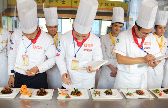 本次基础凉菜班级比赛内容是一道指定菜品,老师们将会根据整体造型、摆盘、颜色搭配、刀功以及调味等方面进行综合打分。凉菜制作是作为一名厨师很重要的一项技能。广西华南烹饪学校的学生在两年的学习中,除了要学习热菜的烹制外,更会专门学习到凉菜、雕刻、火锅、调酒、中西面点等技能。