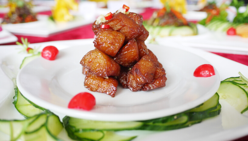 “哇,玲珑宝塔肉,像艺术品一样!”“这个颜色搭配的很有食欲呢,这盘子摆的也很好看。”金牌教室里人头攒动,议论纷纷,到底发生了什么?拨开人群,映入眼帘的尽是美食,原来这是广西华南烹饪学校金牌八班凉菜考核展示。金牌八班的同学们在进行阶段考核的同时,也摆出了自己班级的作品展台,为大家奉上一幅出色的美食画卷。