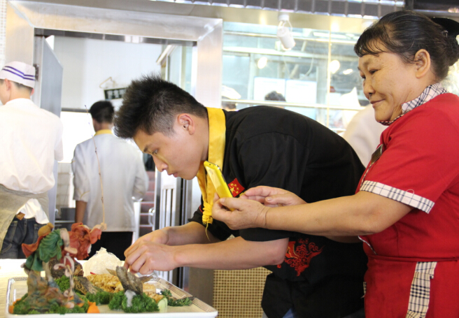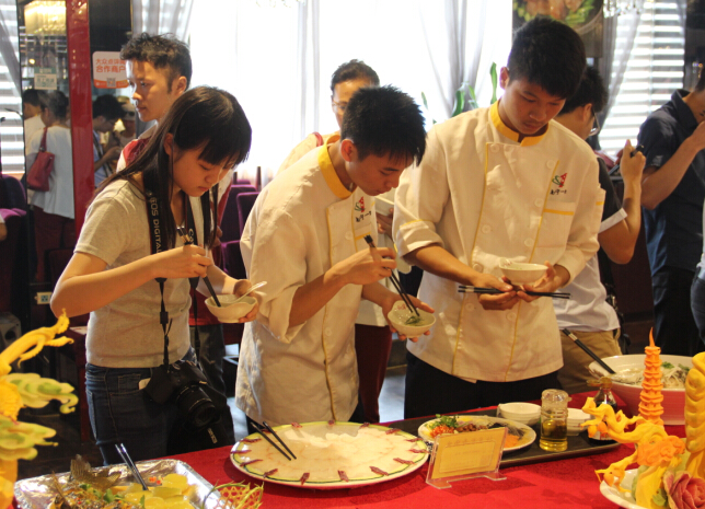 广西华南烹饪学校作为活动的参与者之一,现场华南学子精美的雕刻作品给观众带来了一场视觉上的享受,除此之外,现场还有不少制作食材是广西的特色食材,如“鱼蓉像生果”“麦香鱼排”“象形葡萄糖醋鱼”“松子鱼排”等经过创新,做成了口感酸辣嫩脆美食。广西烹饪餐饮行业协会会长曾大文表示,希望借交流推广会的机会,挖掘广西本地特色、优质食材,切磋厨艺,推动桂菜的发展。