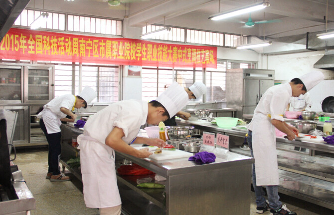 5月20日,由南宁市人力资源和社会保障局、南宁市职业技能鉴定中心主办2015年全国科技活动周南宁区市属职业院校学生职业技能大赛在南宁三职校隆重举行。据悉,本次大赛设有中式烹调师、汽车修理工、计算机操作员、美发师等8个工种比赛,其中我校派出中职组10人参加中式烹调师的角逐。