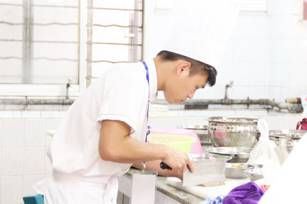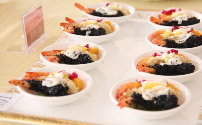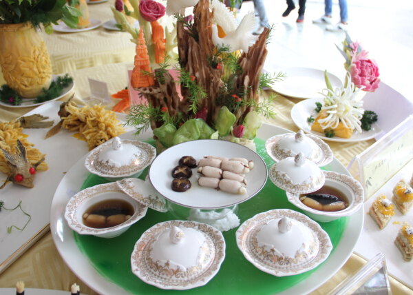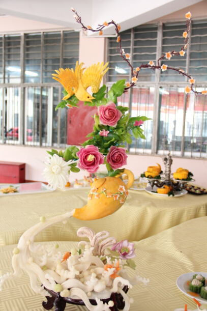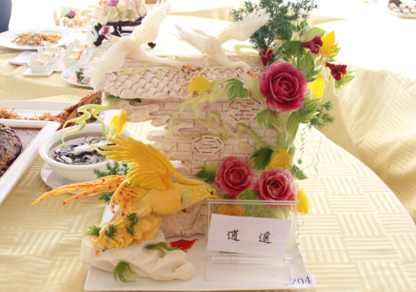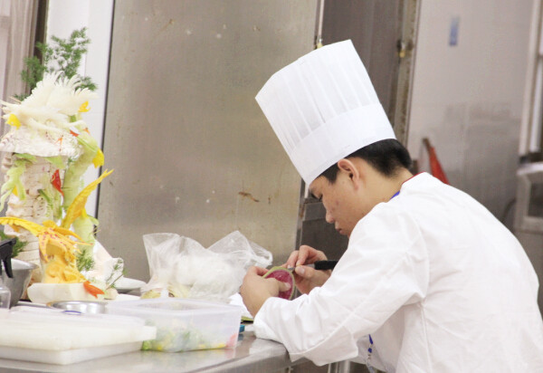 本次技能大赛中式烹调师竞赛项目由专业理论笔试、花朵组雕、规定菜、自选菜四个子项目构成,并由广西烹饪餐饮行业协会和南宁市职业技能鉴定中心资深考评专家担任大赛评委。根据比赛规则,选手们按照比赛要求严格、紧张、有序的进行,整个赛场始终洋溢着欢快的锅碗瓢盆交响乐。在菜品展示区,精致、美味的参赛作品吸引着各参观者的眼球与相机,现场充满着探讨、交流、学习的热烈气氛。
