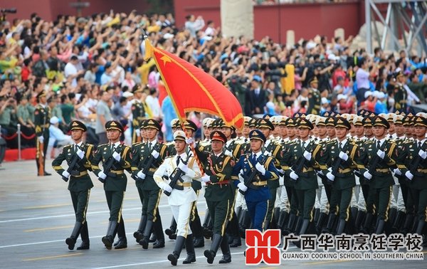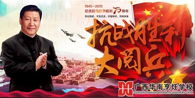 在隆重纪念抗战胜利70周年阅兵,广西华南烹饪学校全体师生会以饱满的精神、昂扬的斗志,共同见证这一庄严而神圣的时刻;会用实际行动,做点力所能及的小事,去见证我们爱党、爱国、爱家。