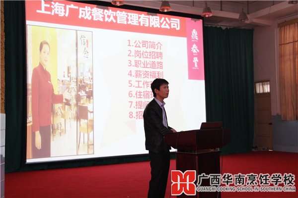 近日,上海广成餐饮管理有限公司来我校开展招聘宣讲会,由该公司人力资源部招聘主管孙主管负责宣讲,广西华南烹饪学校的毕业生学子参加了本次宣讲会。