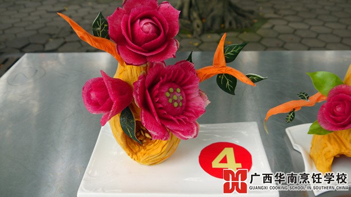 首先进行的是雕刻测试,测试规则是测试者根据抽签内容,将萝卜雕刻成不同种类的花朵,此考核不仅时间有要求,质量也是考核的内容,最后综合分数成为测试的最终分数。测试一开始,同学们就展示了他们这几个月的苦练的成果,尽管是在计时测试,他们的表现淡定从容、刀法熟练精湛,充分展示了他们的实力。