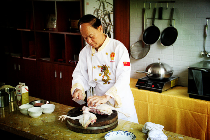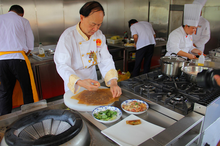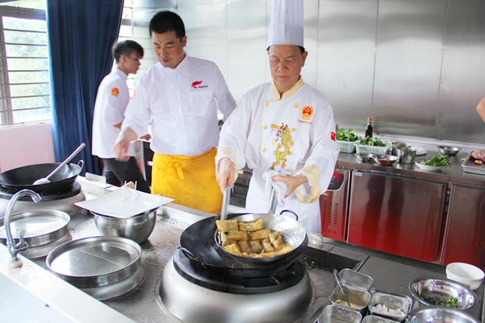 当天上午,何逸奎大师向广西华南的老师们演示了经典桂菜纸包鸡的做法,赢得了全场老师的热烈鼓掌。