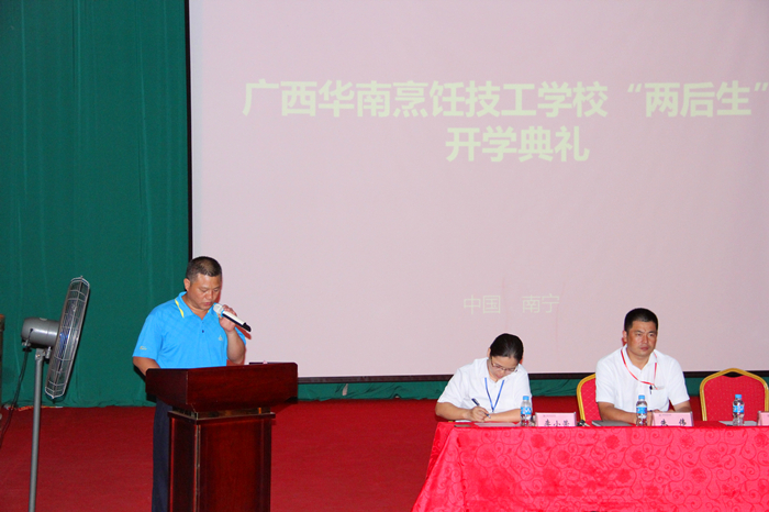 隆林各族自治县人社局副局长唐军,广西华南烹饪技工学校副校长朱伟,广西华南烹饪技工学校大学校区教务主任黄盛,广西华南烹饪技工学校第一期班主任欧志明,广西华南烹饪学校行政负责人李小荣参加了开学典礼。开学典礼由广西华南烹饪学校行政负责人李小荣主持。