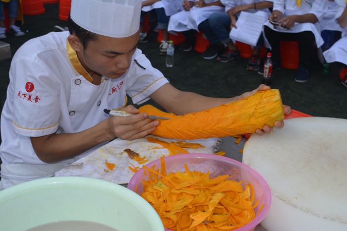 精雕细琢、巧夺天工。在雕刻赛场,只见广西华南烹饪的参赛选手双手配合灵活巧妙、刻刀一进一出、左右旋转几次,一片片孔雀羽毛就呈现在大家面前,线条清晰流畅,造型美观,构思巧妙,浑然天成。再经过选手的精心组装,一件件精美的雕刻作品,让人大开眼界,赞叹不已。