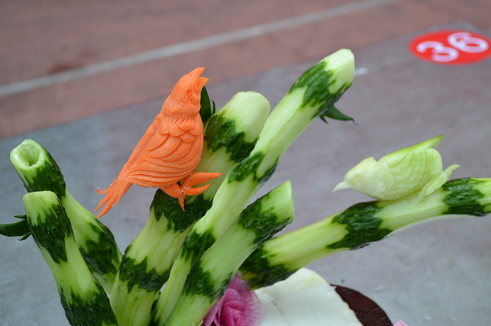 高手如云,同台竞技。在拼盘赛区,生活中最常见的萝卜、黄瓜等食材在他们手中化腐朽为神奇,一双巧手勾勒出一幅幅美丽的画卷。“鹰击长空”、“迎客松”、“鸟语花香”、“大鹏展翅”……等冷拼作品,生动活泼、创意无限,用最普通的食材,打造盘中最美的艺术。