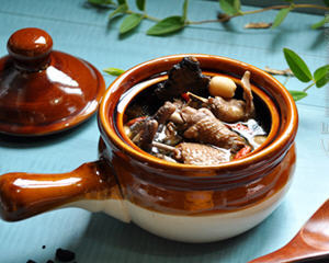 3.将沙锅置旺火上,加鲜汤,入鸡药包,汤沸后,撇去浮沫,再加姜、葱、绍酒,移至小火上炖至鸡肉和骨架软,加精盐、胡椒粉、味精调味,除去药包、姜、葱即成,酌量佐餐食。