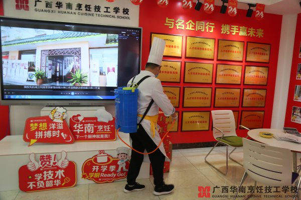 疫情前线激战正酣,全国紧急动员。广西华南烹饪技工学校也积极应战,全面投入到了宣传战役中来。与此同时,学校值班老师每天都会对校园、教室、办公室、食堂、宿舍等进行严格的消毒工作,保证无缝隙无死角,让病毒无藏身之处。